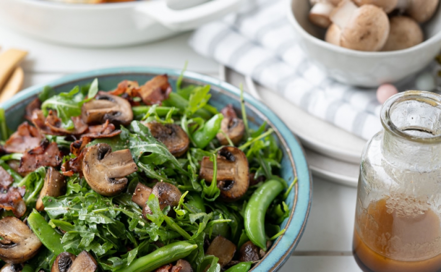 7. Combine the salad by placing rocket in a large serving bowl. Add half of the dressing and toss to coat. Add mushrooms and sugar snap peas. Toss to combine. Top with crispy pancetta and season with extra dressing and cracked pepper.